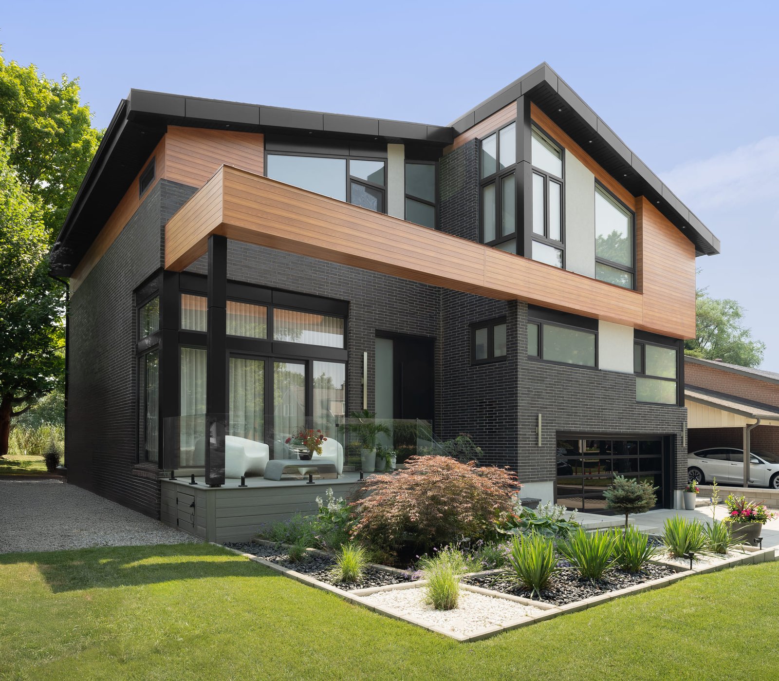 The dramatic cantilever design with warm wood-grain aluminum creates stunning elevation and architectural depth against the dark brick foundation.